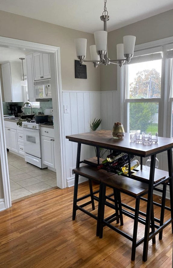 -Functional & Practical -- Function as both a counter top and as a kitchen table that was absolutely ideal for limited space. The stools fit almost perfectly underneath and do not stick out. Industrial style design, rustic brown finish easy to blend with all kinds of furniture.